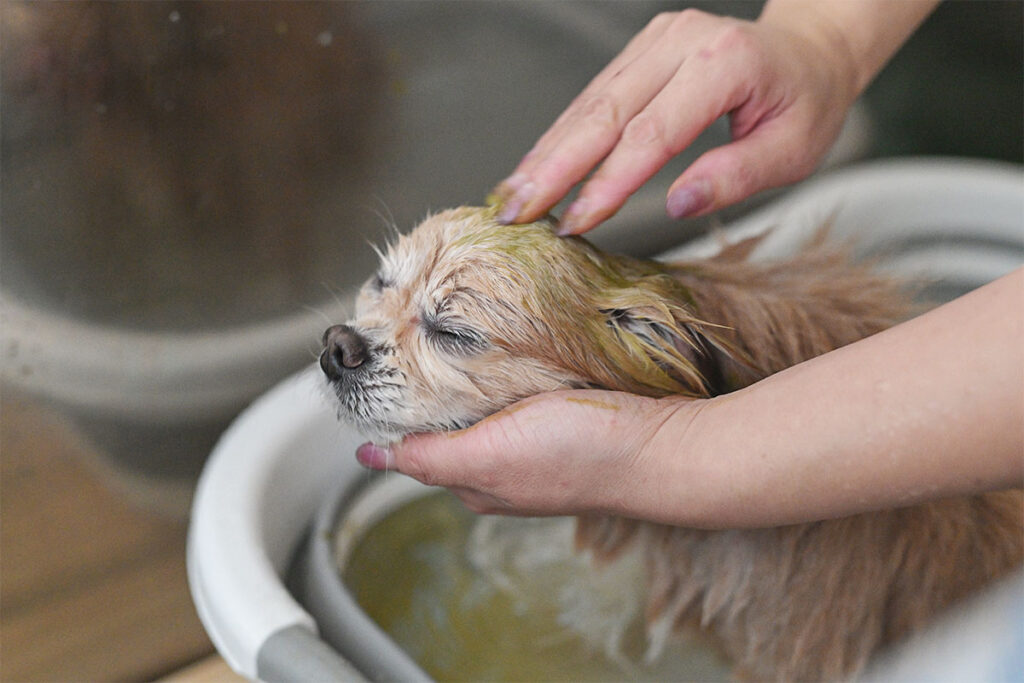 しっかり汚れを落とすプレシャンプー、薬用シャンプー、つやつやな仕上がりのコンデショナー。わんちゃんに合わせて使い分けます